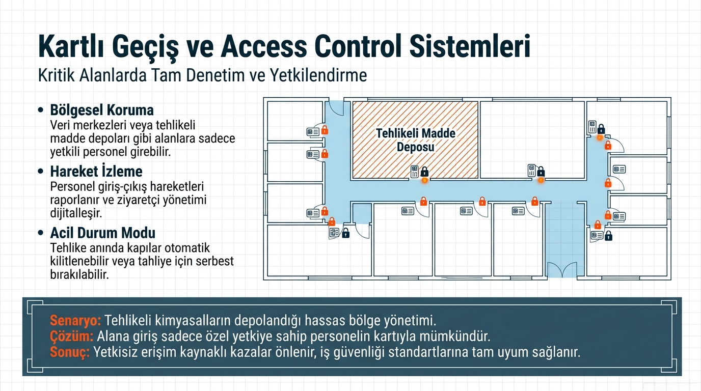 Tehlikeli kimyasalların depolandığı alana sadece yetkili personelin kartla erişebilmesi güvenliği artırır.