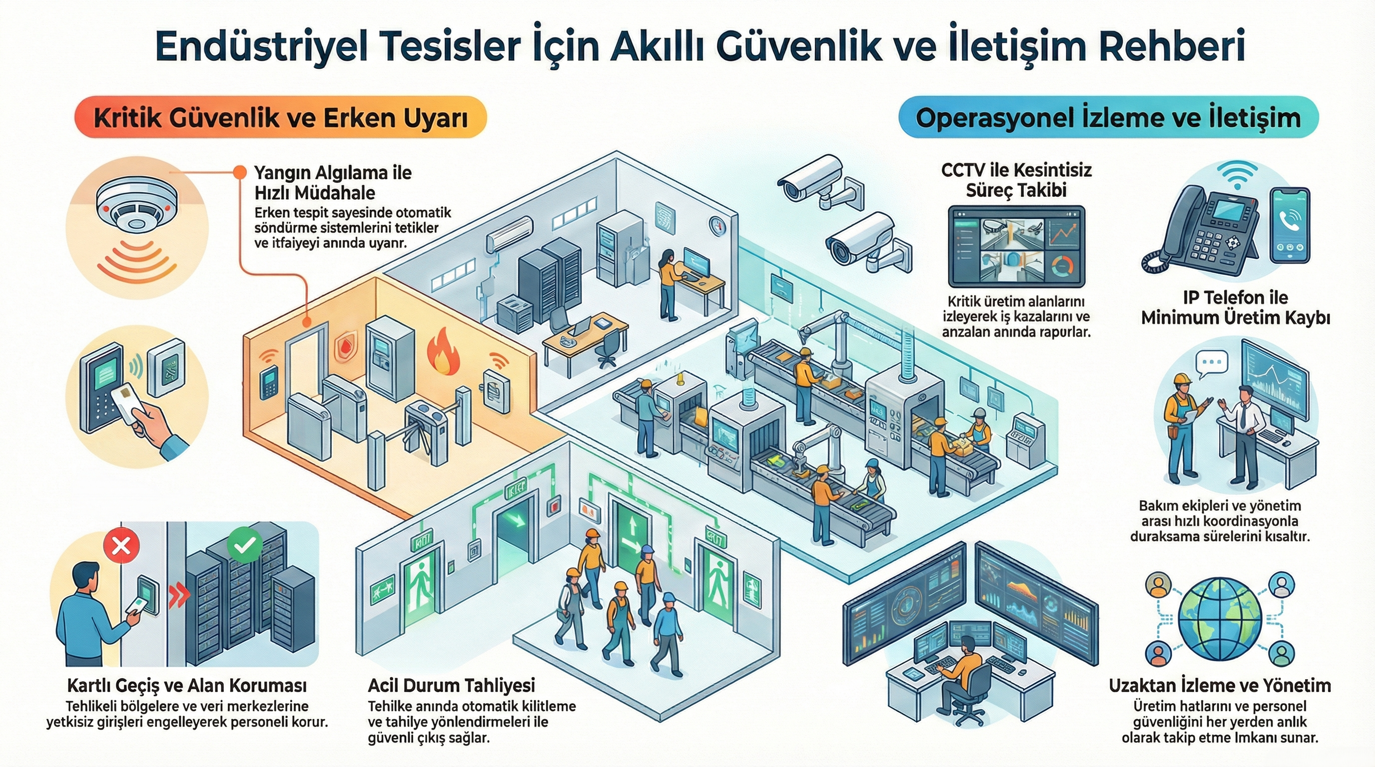 Sanayi tesislerinde yetkilendirilmiş geçiş kontrolü çok önemlidir. Bu sistemlerle: