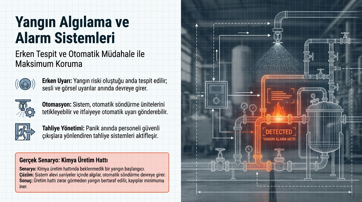Kimya üretim hattında meydana gelen bir yangın kısa sürede algılanarak otomatik söndürme devreye alınır, kayıplar minimuma iner.
