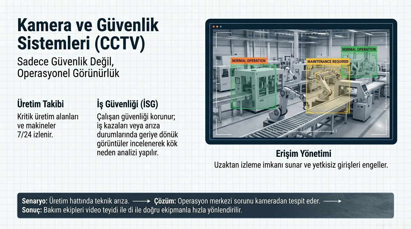 Üretim hattında yaşanan bir arıza kameradan izlenerek bakım ekipleri hızlı şekilde yönlendirilebilir.