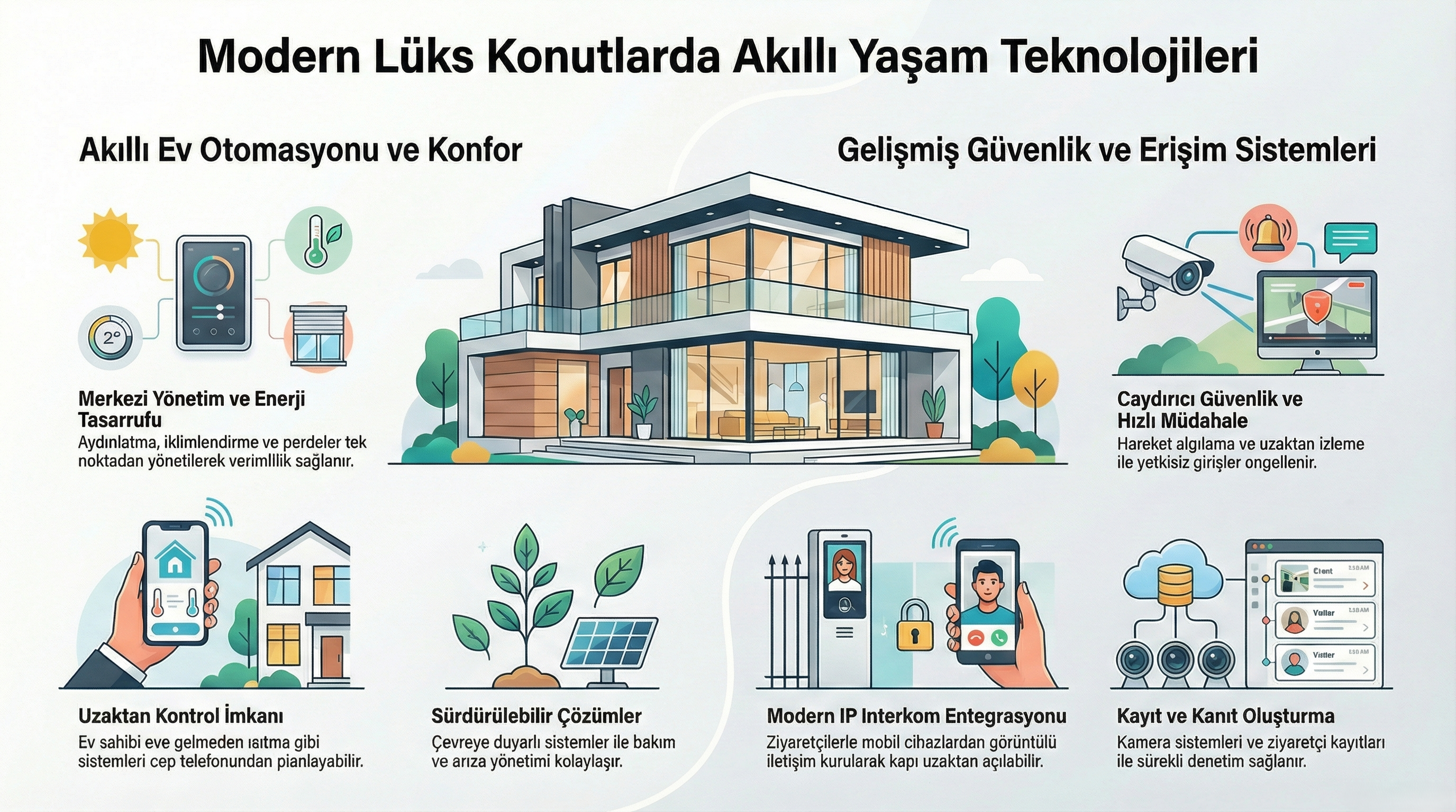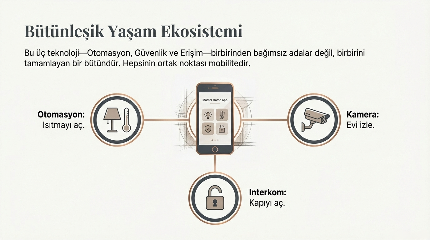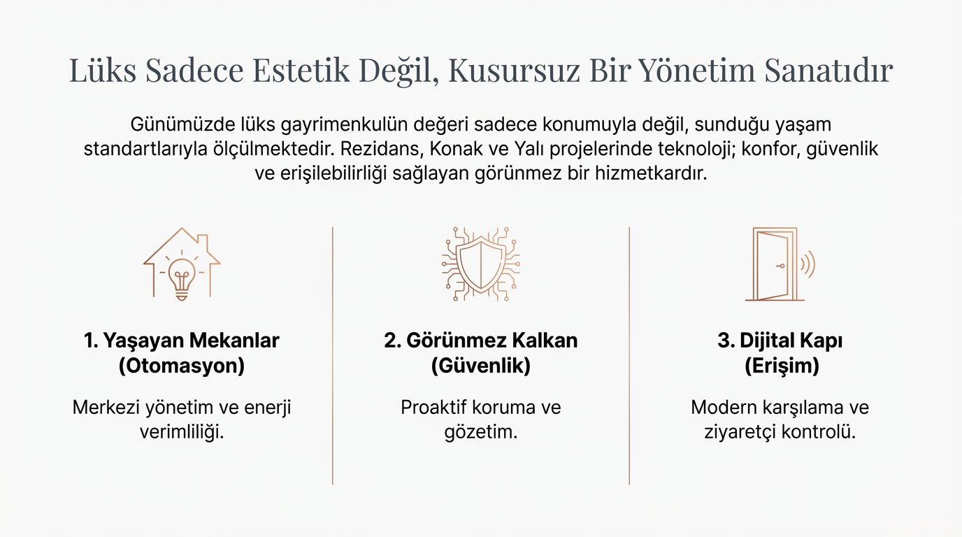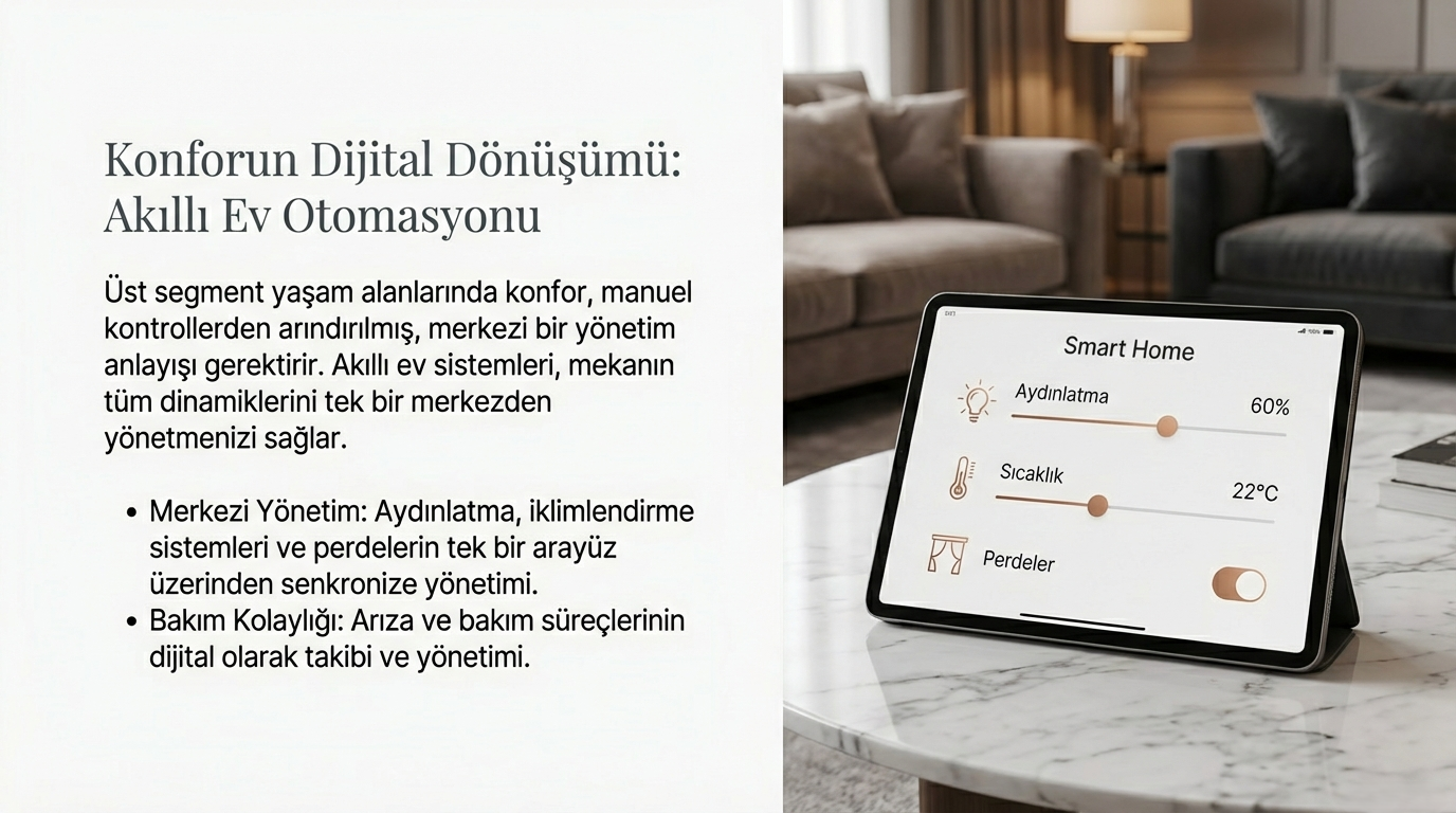Üst segment yaşam alanlarında konforu ve güvenliği artırmak için akıllı ev otomasyonları vazgeçilmezdir. Bu sistemlerle: