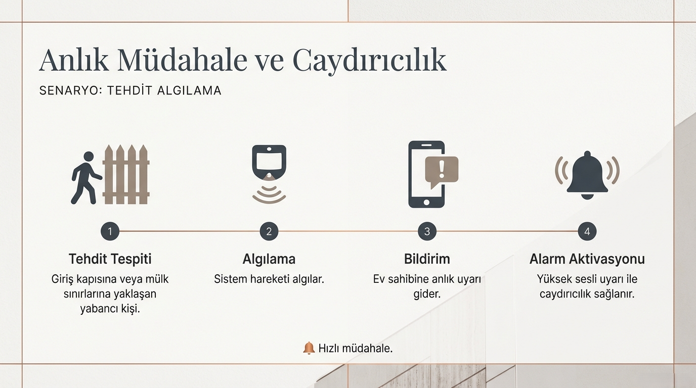 Giriş kapısına yaklaşan yabancı bir kişi alarm sistemini devreye alarak caydırıcı etki oluşturur.
